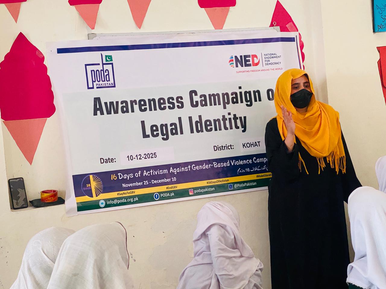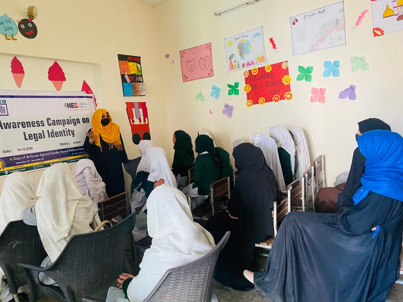 10 December, PODA Pakistan organized an awareness session on the importance of legal identity as part of the 16 Days of Activism campaign under the Rural Women’s Network for Civic Leadership and Participation Project, funded by the National Endowment for Democracy (NED). The activity was held at Edwards Public School, Kohat.