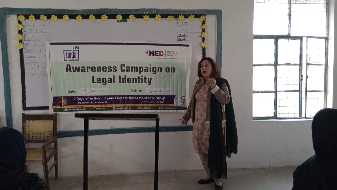 On 10 December, PODA Pakistan organized an awareness session on the importance of legal identity as part of the 16 Days of Activism campaign under the Rural Women’s Network for Civic Leadership and Participation Project, funded by the National Endowment for Democracy (NED). The activity was conducted at the Government Girls Higher Secondary School, Sialkot.