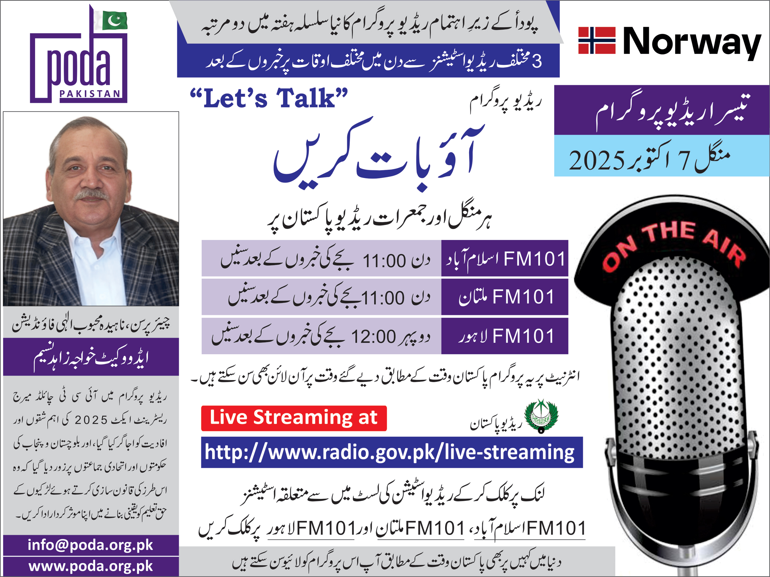 New Educational Series of Radio Programs by PODA from 3 Different FM 101 Radio Stations at Different Times of the Day 3rd Radio Program – Tuesday 7 October, 2025 FM 101 Islamabad – Listen...