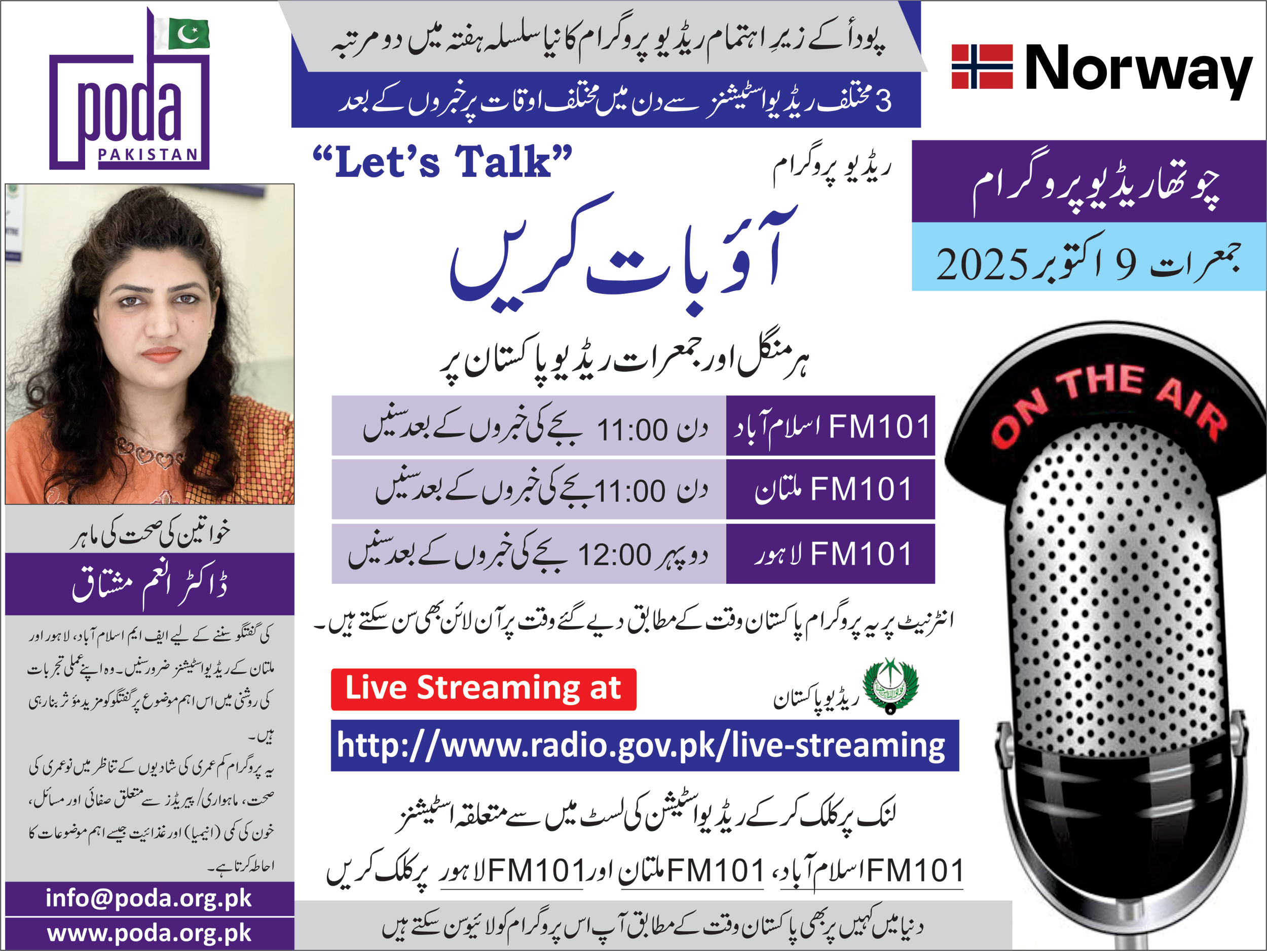 New Educational Series of Radio Programs by PODA from 3 Different FM 101 Radio Stations at Different Times of the Day 4th Radio Program – Thursday 9 October, 2025 FM 101 Islamabad – Listen...