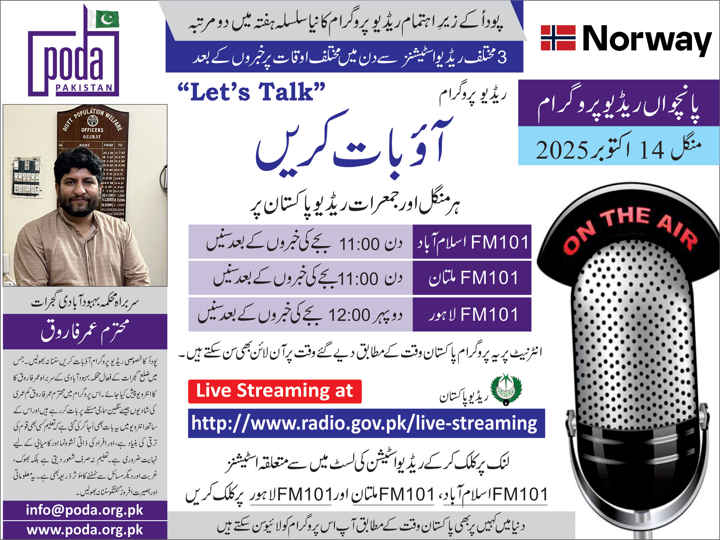 New Educational Series of Radio Programs by PODA from 3 Different FM 101 Radio Stations at Different Times of the Day 5th Radio Program – Tuesday 14 October, 2025 FM 101 Islamabad – Listen...
