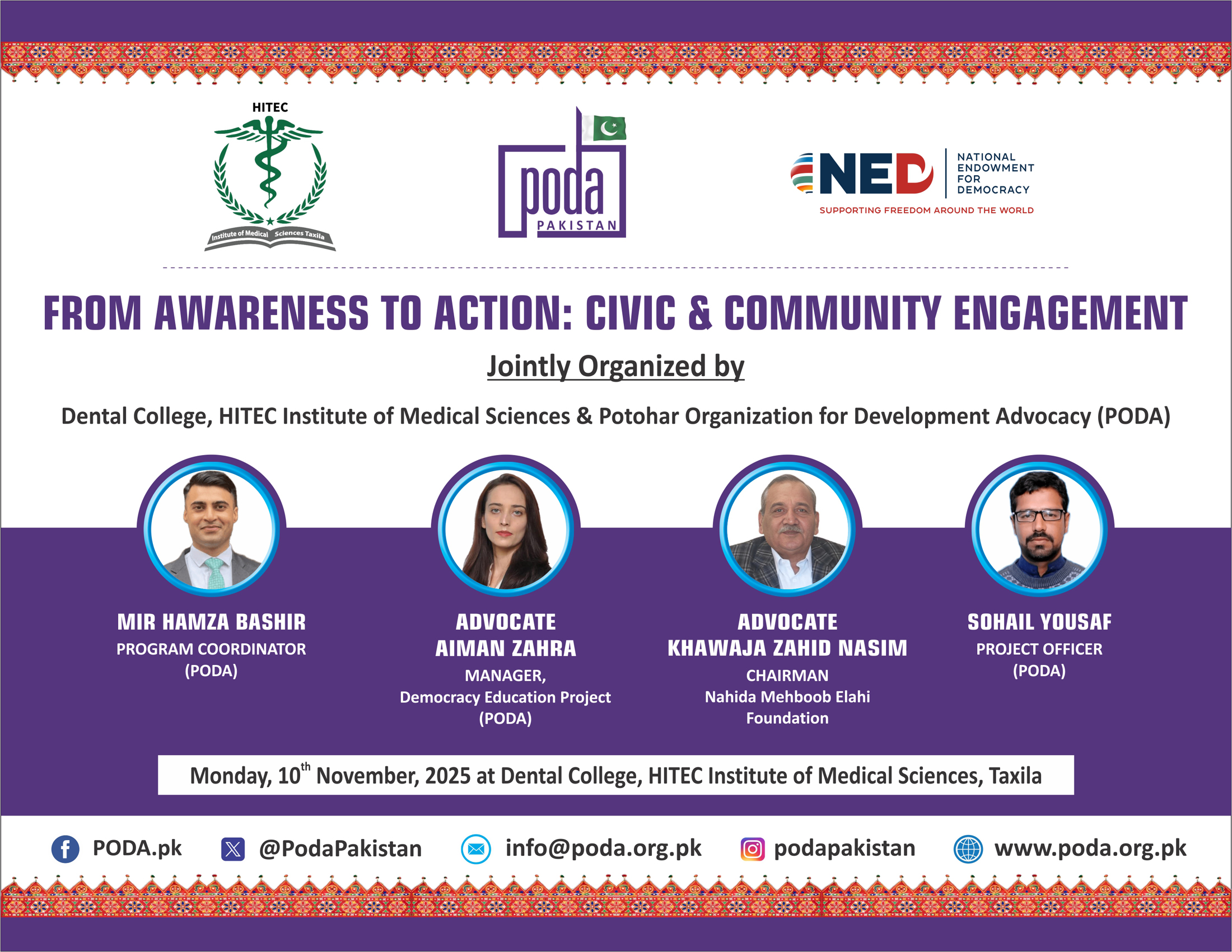 From Awareness to Action: Civic and Community Engagement Monday, November 10, 2025: Potohar Organization for Development Advocacy (PODA) in collaboration with the Dental College, HITEC Institute of Medical Sciences, organized a session under the...