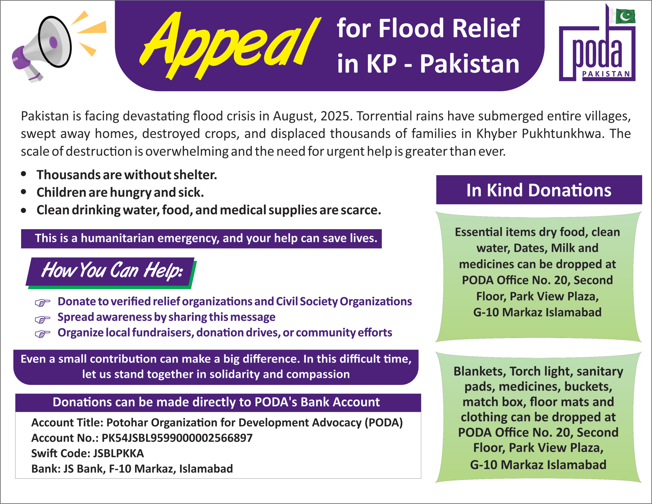 PODA team visited flood-affected areas of District Buner, including Pir Baba and Beshonai village, to provide essential support to affected communities. Hygiene kits, clothing, and other necessary items were distributed, with a particular focus...