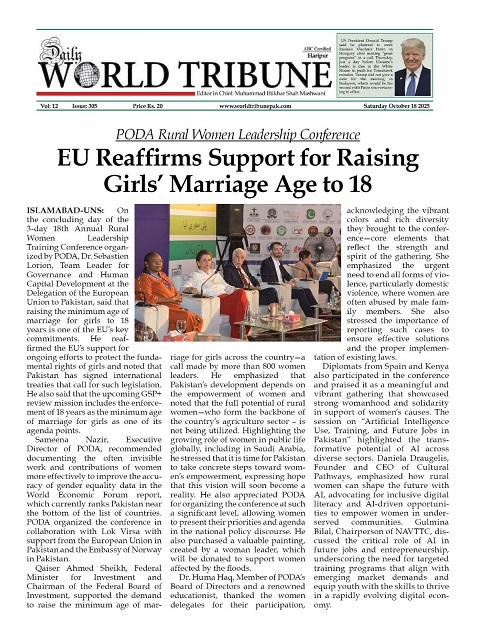 ISLAMABAD: The European Union on Friday reaffirmed its commitment to supporting Pakistan in raising the minimum age of marriage for girls to 18 years, as discussions at the 18th Annual Rural Women Leadership Training...