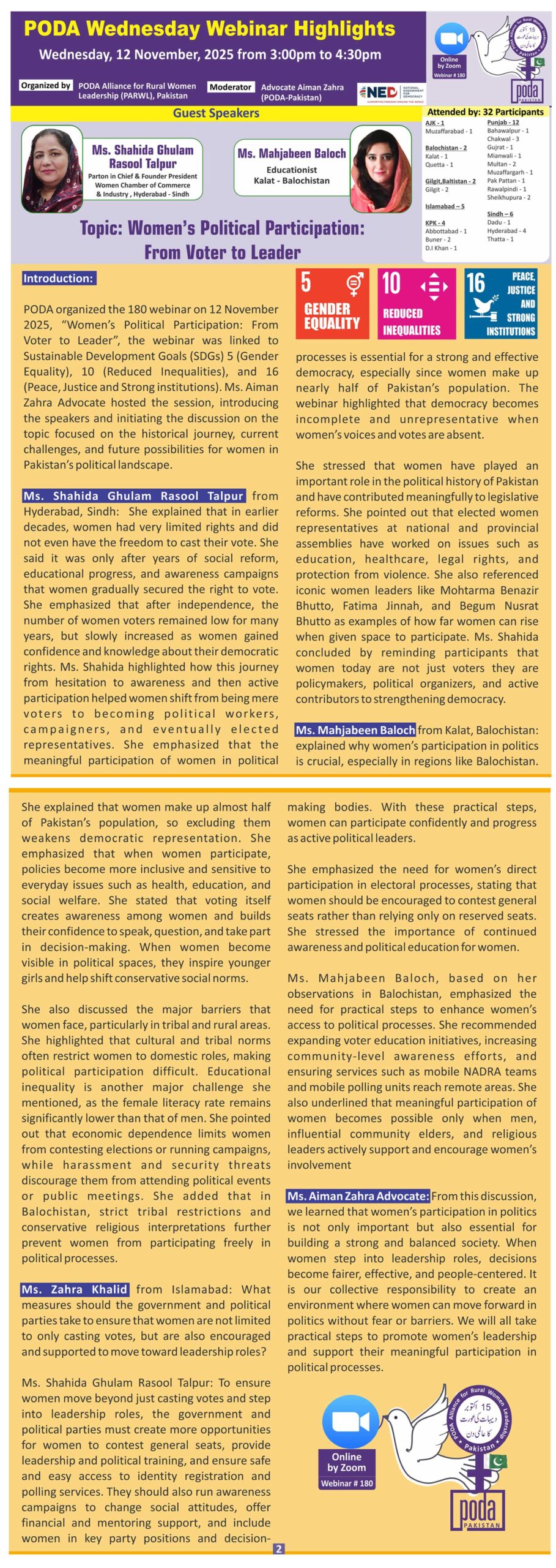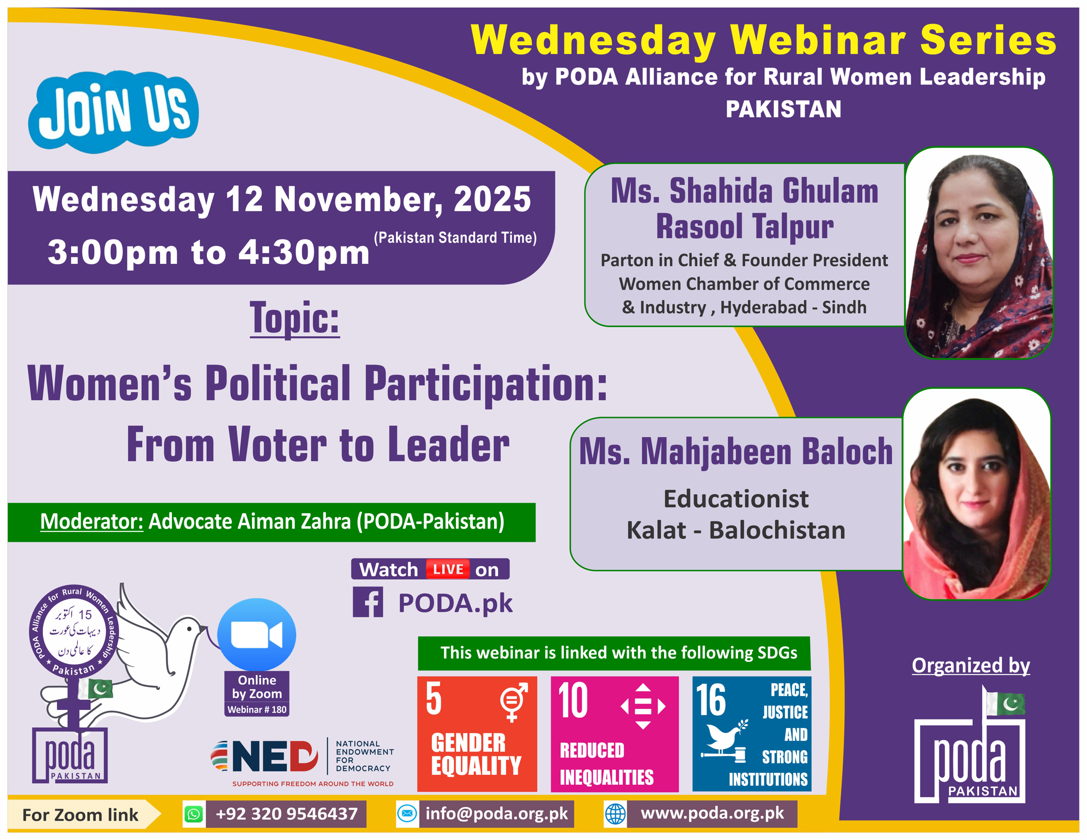 Join us on Wednesday 12 November, 2025 from 3:00pm to 4:30pm Pakistan Time on Zoom Our speakers this week are Topic: Women’s Political Participation: From Voter to Leader Moderator: Advocate Aiman Zahra (PODA-Pakistan) PLEASE...
