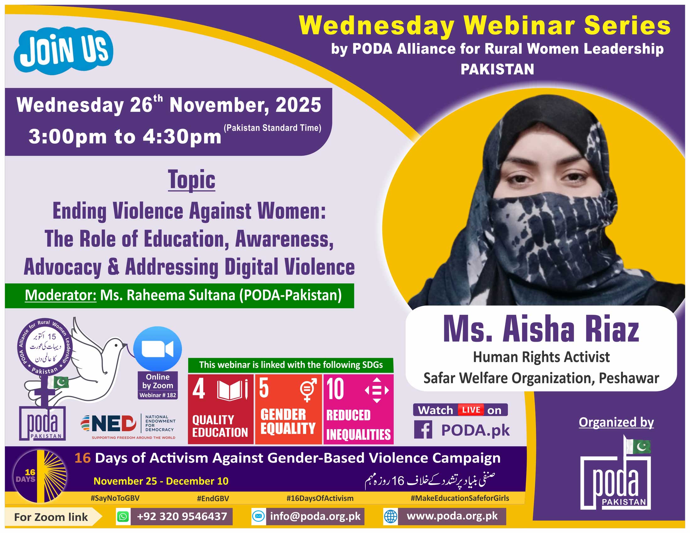 Join us on Wednesday 26 November, 2025 from 3:00pm to 4:30pm Pakistan Time on Zoom Our speaker this week is Ms. Aisha Riaz, Human Rights Activist, Safar Welfare Organization – Peshawar Topic: Ending Violence...