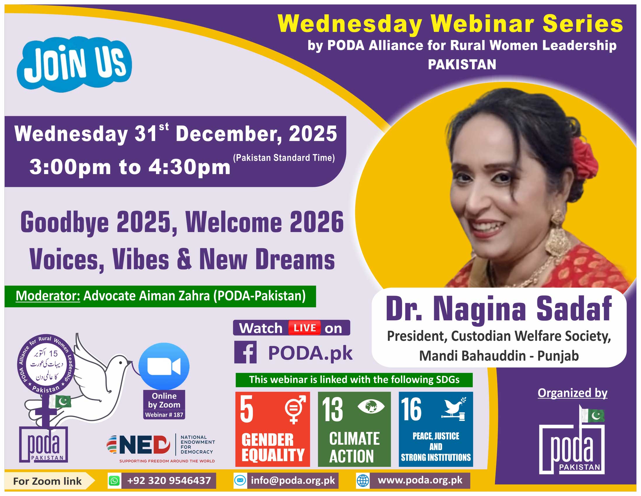 Join us on Wednesday 31 December, 2025 from 3:00pm to 4:30pm Pakistan Time on Zoom Our speaker this week is Dr. Nagina Sadaf, President, Custodian Welfare Society, Mandi Bahauddin, Punjab. Topic: Goodbye 2025, Welcome...