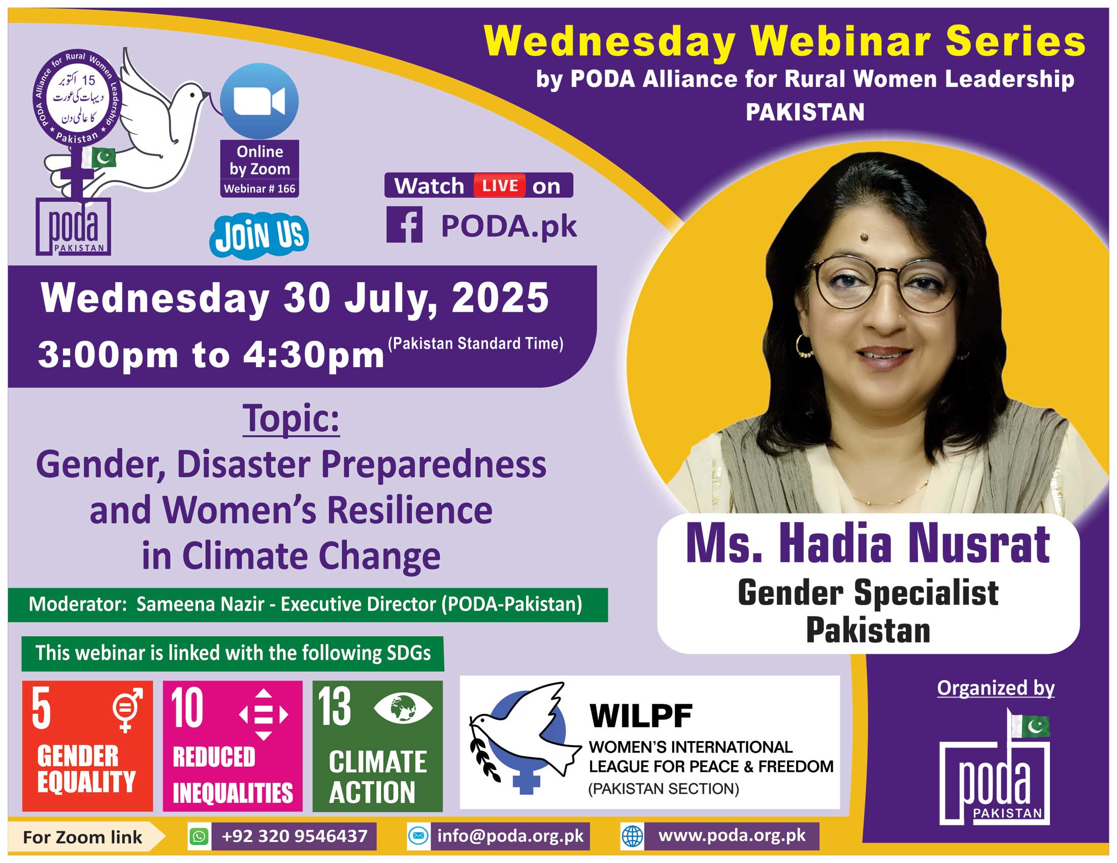 Join us on Wednesday 30 July, 2025 from 3:00pm to 4:30pm Pakistan Time on Zoom Our Speaker this week is Ms. Hadia Nusrat – Gender Specialist Pakistan Topic: Gender, Disaster and Preparedness and Women’s...