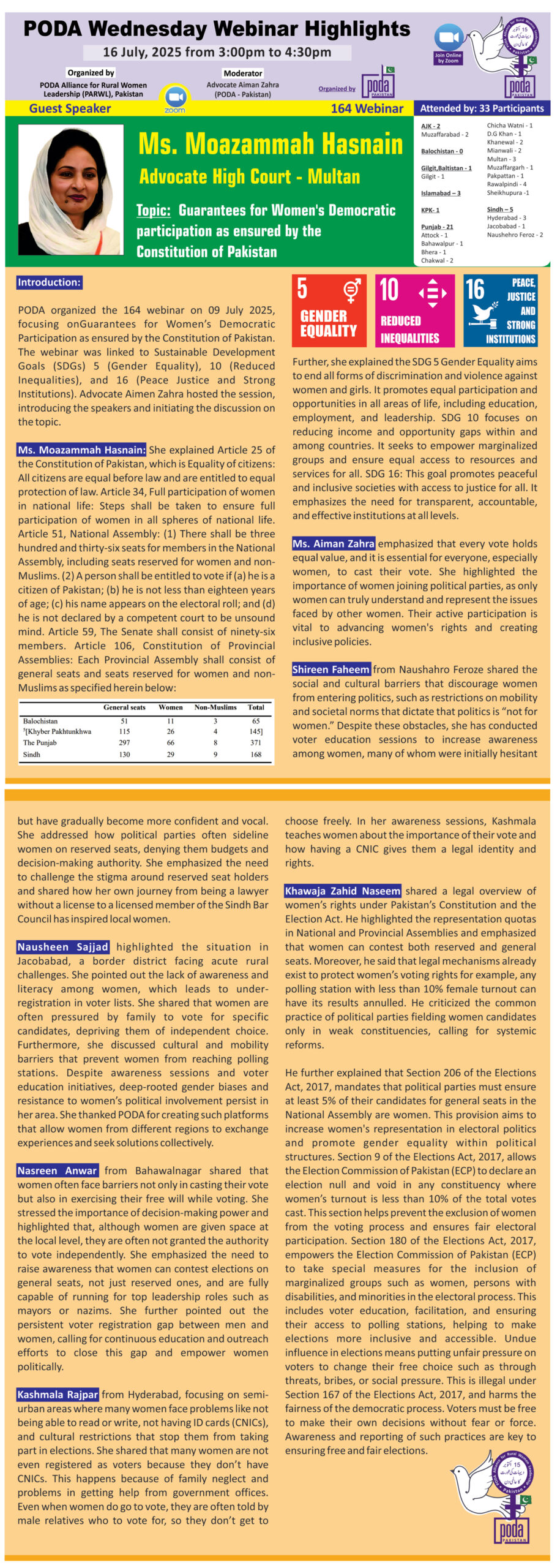 Join us on Wednesday 16 July, 2025 from 3:00pm to 4:30pm Pakistan Time on Zoom Our Speaker this week is Ms. Moazammah Hasnain, Advocate High Court – Multan Topic: Guarantees for Women’s Democratic participation...