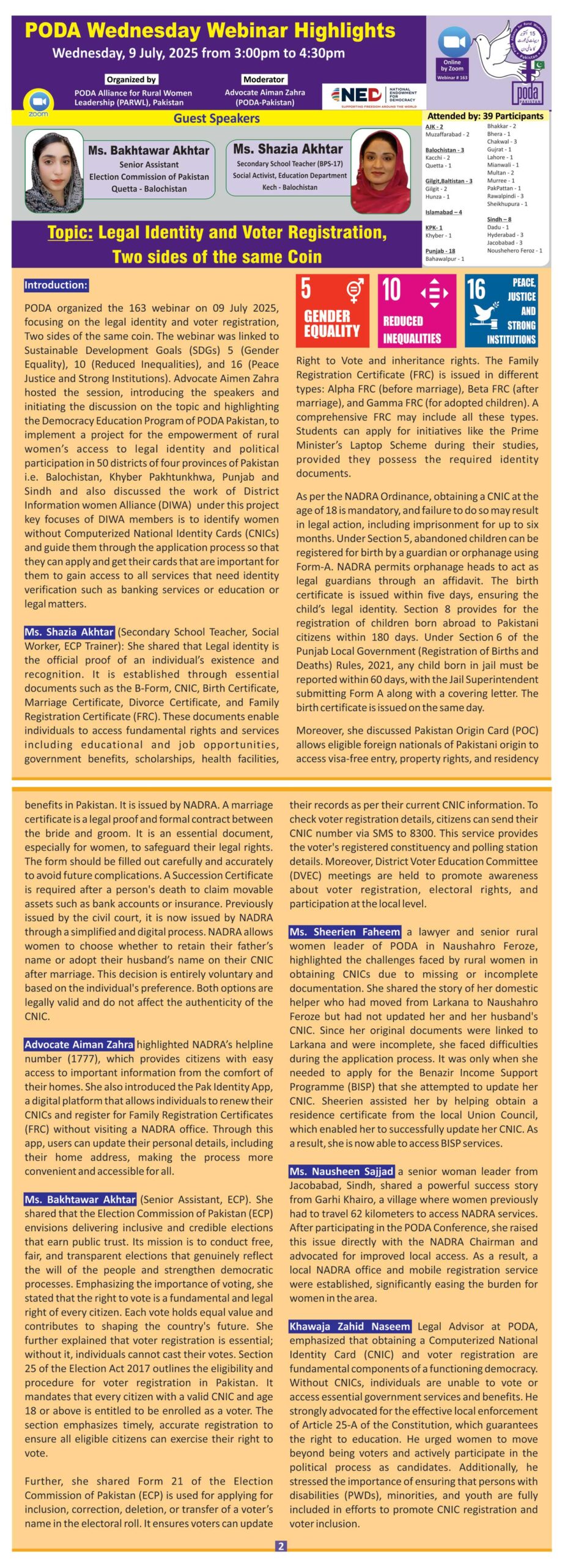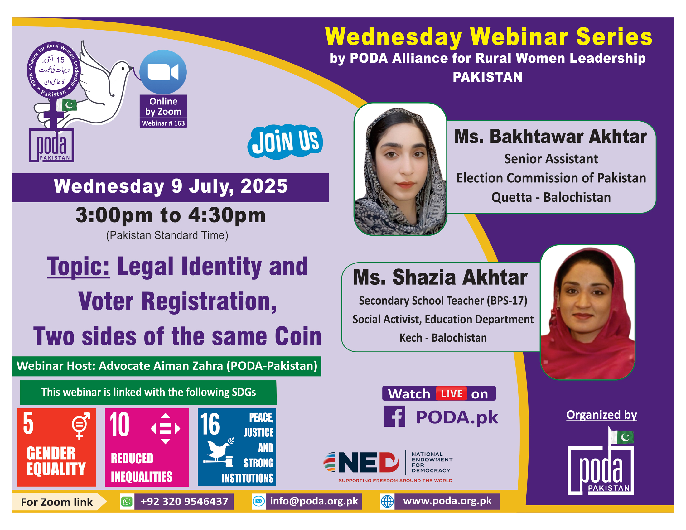 Join us on Wednesday 9 July, 2025 from 3:00pm to 4:30pm Pakistan Time on Zoom Our Speakers this week are: Topic: Legal Identity and Voter Registration, Two sides of the Same Coin. Moderator: Advocate...