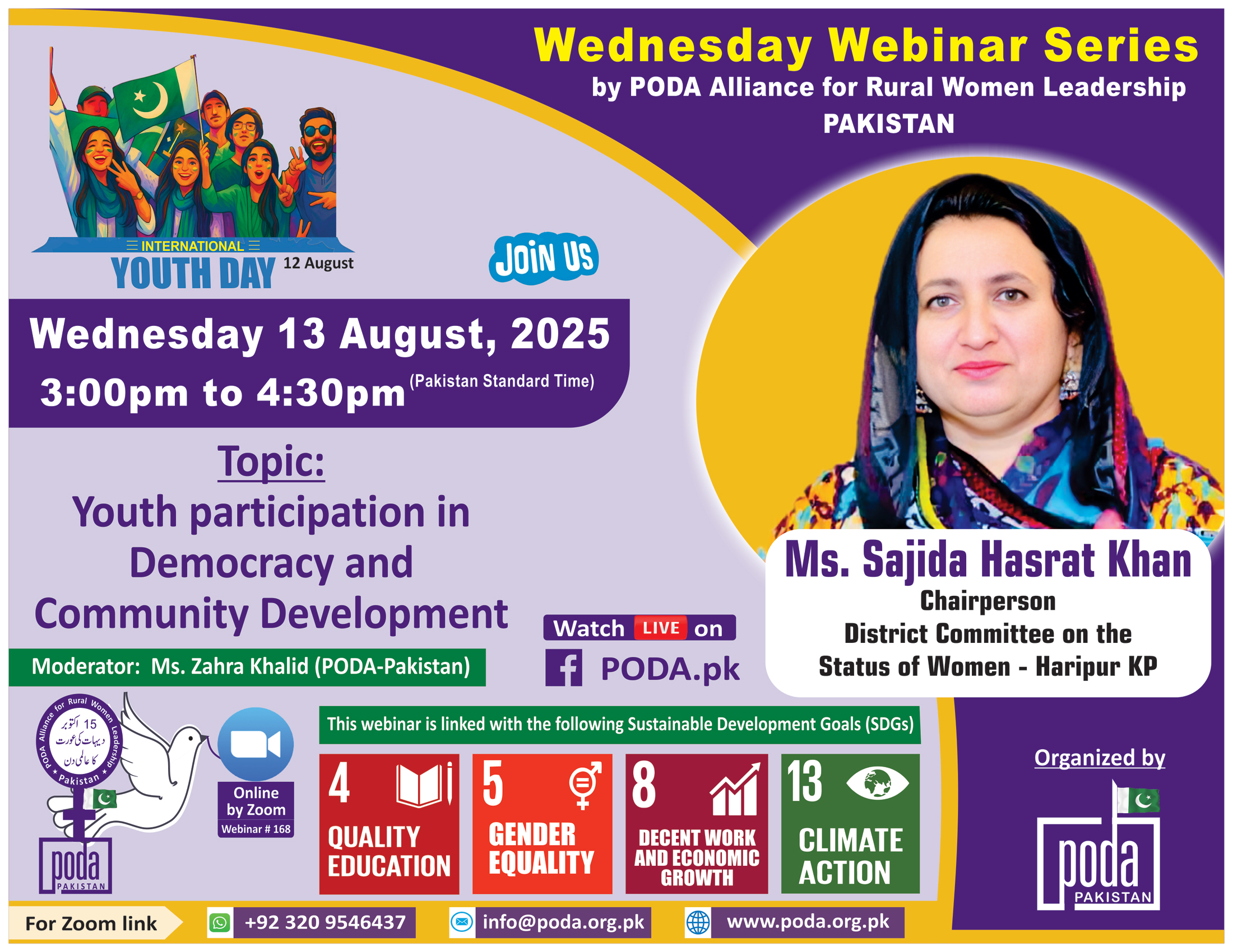 Join us on Wednesday 13 August, 2025 from 3:00pm to 4:30pm Pakistan Time on Zoom Our speaker this week is Ms. Sajida Hasrat Khan – Chairperson, District Committee on the Status of Women, Haripur,...