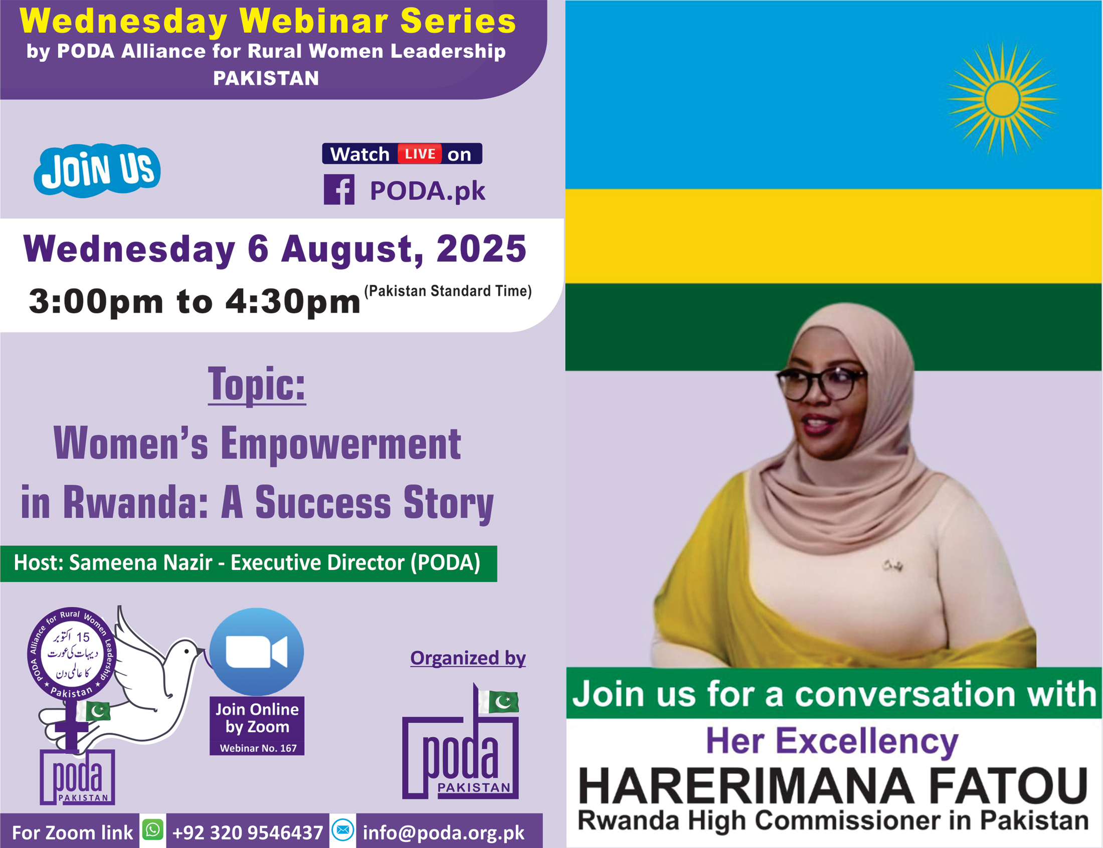 Join us on Wednesday 6 August, 2025 from 3:00pm to 4:30pm Pakistan Time on Zoom Join us for a conversation with Her Excellency Harerimana Fatou – Rwanda High Commissioner in Pakistan. Topic: Women’s Empowerment...