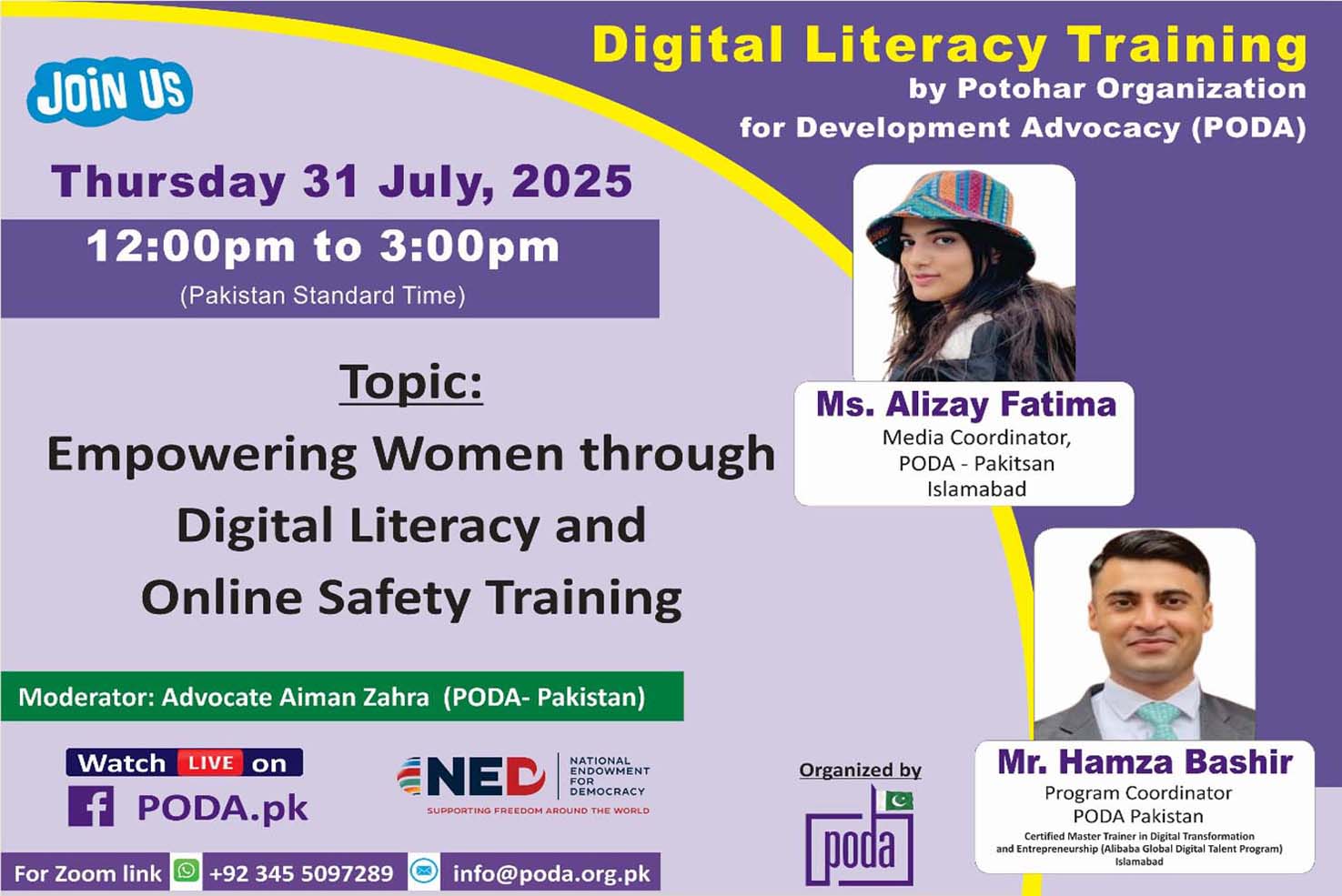 Two expert speakers led the session. Ms. Alizay Fatima talked about online safety and how to use the internet intelligently. She shared useful tips to protect yourself from online scams and risks. Her main topics included: an Introduction to Digital Literacy, Responsible Use of Social Media how to move from just scrolling to using social media in a smart and meaningful way, Recognizing and Avoiding Online Risks like fake news, scams, and frauds with real-life examples, Protecting Your Digital Self by using strong passwords, keeping your accounts private, and staying safe on apps like WhatsApp and Facebook, and finally, Daily Safety Habits easy steps you can follow every day to stay safe online. She also explained how digital tools can be used in a good way to support your work and help your community.
