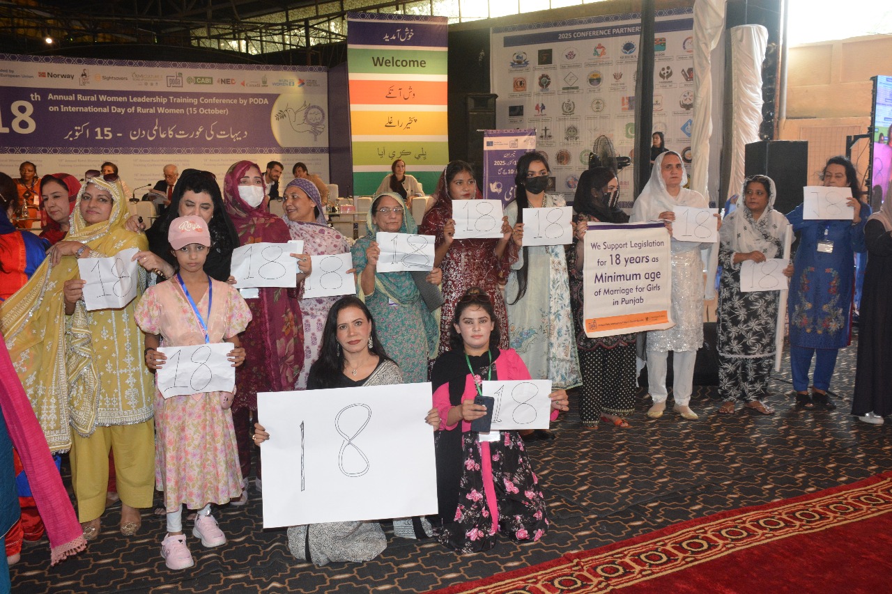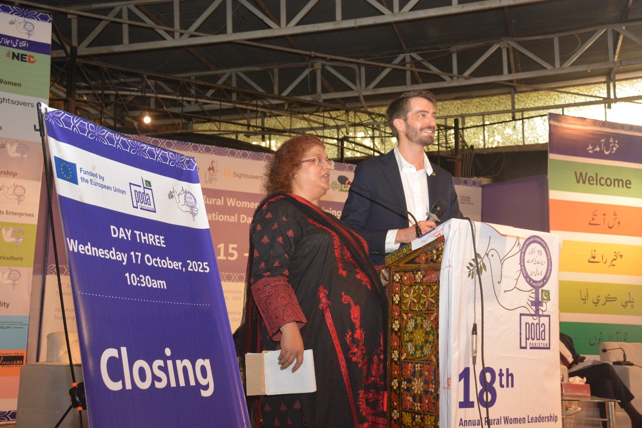Islamabad, Friday 17 October 2025: On the concluding day of the 3-day 18th Annual Rural Women Leadership Training Conference organized by PODA, Dr. Sebastien Lorion, Team Leader for Governance and Human Capital Development at the Delegation of the European Union to Pakistan, said that raising the minimum age of marriage for girls to 18 years is one of the EU’s key commitments. He reaffirmed the EU’s support for ongoing efforts to protect the fundamental rights of girls and noted that Pakistan has signed international treaties that call for such legislation. He also said that the upcoming GSP+ review mission includes the enforcement of 18 years as the minimum age of marriage for girls as one of its agenda points.