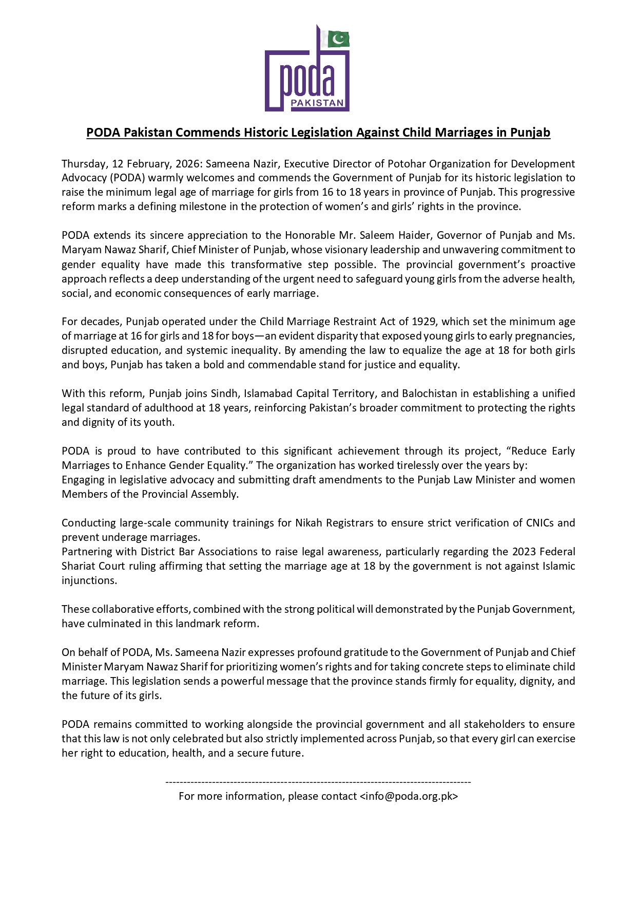 Thursday, 12 February, 2026: Sameena Nazir, Executive Director of Potohar Organization for Development Advocacy (PODA) warmly welcomes and commends the Government of Punjab for its historic legislation to raise the minimum legal age of marriage for girls from 16 to 18 years in province of Punjab. This progressive reform marks a defining milestone in the protection of women’s and girls’ rights in the province.
