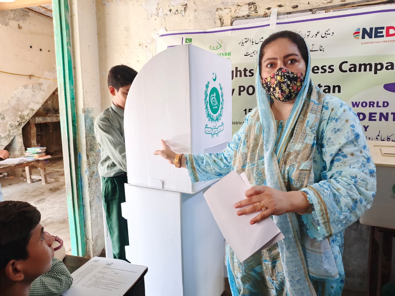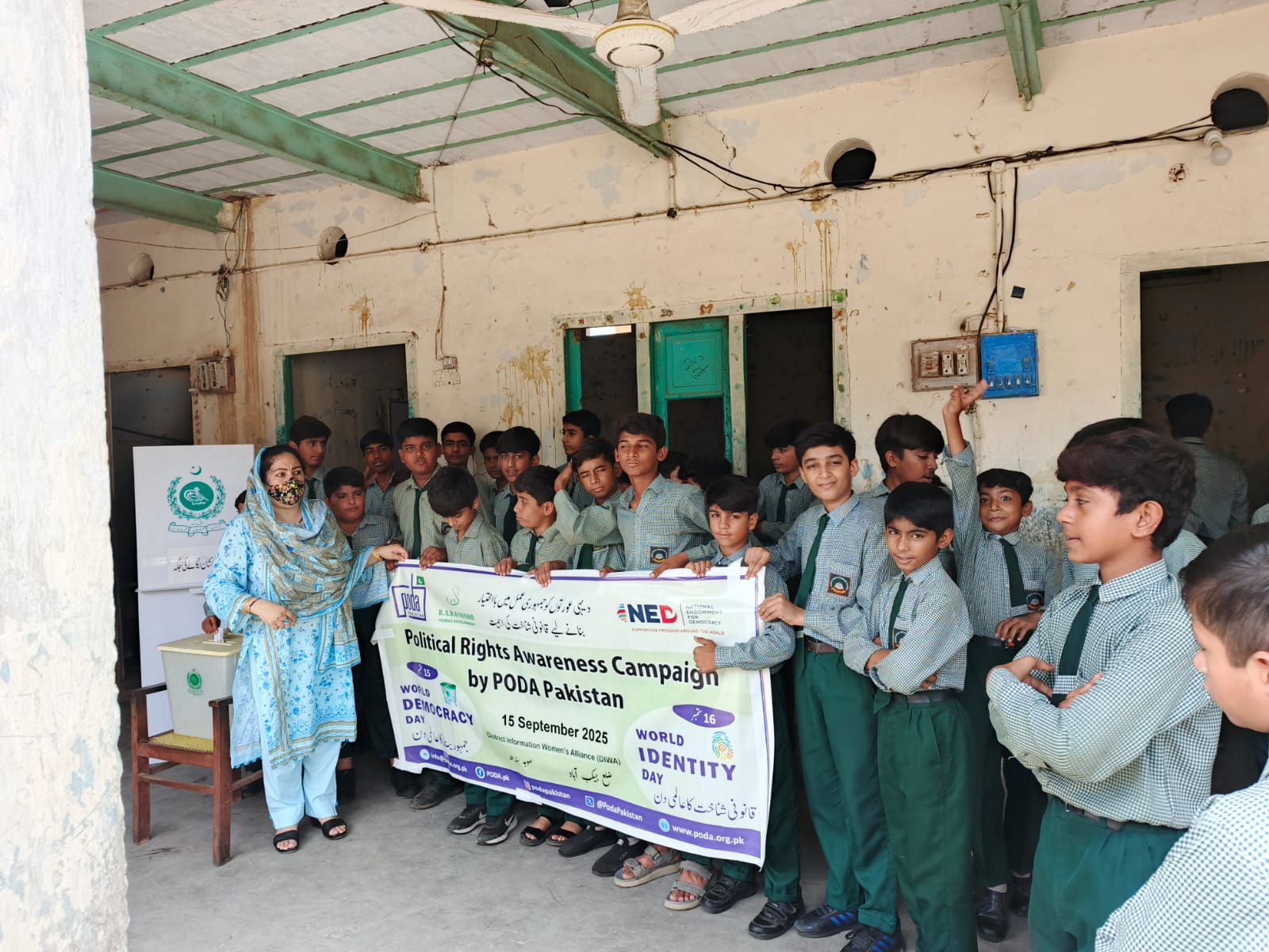 16 September 2025: PODA conducted Mock Polling Sessions for women and youth at Paras Public School, Jacobabad, Sindh. The activity was part of the Rural Women’s Network for Civic Leadership and Participation Project, funded by the National Endowment for Democracy (NED), and aligned with International Democracy Day and World Identity Day. The aim was to promote civic engagement among women and youth by giving them practical training on the voting process.